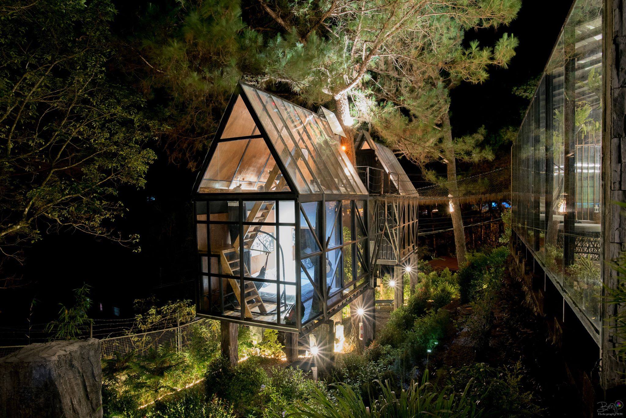 Each treehouse features a cozy living space, king-sized bed, shower with sky view, and grand garden and forest sights.